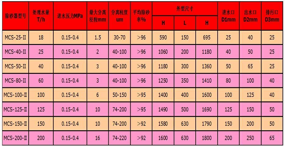 4、進(jìn)水壓力 ≥0.4Mpa 5、壓力損失 0.028Mpa 6、除砂直徑 >0.8mm